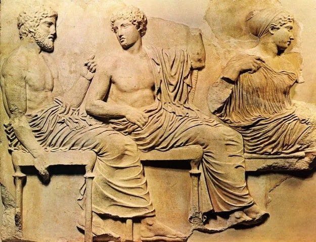 Alas, were the images cast on Plato’s cave walls none other than the “phantasma” inhabiting the minds of the Greeks—which in Plato’s view may or may not have always been reflective of the real thing? From Hesiod’s Works and Days and Homer’s Iliad and Odyssey to tragedians like Aeschylus and Sophocles, poets were the original image-makers shaping the psycho-cosmological matrix of ancient Greece. This matrix included the images of the gods themselves, their genealogies, the histories of heroes, and the various “ages of man”—all of which were essentially derived from the poets’ treatment of the gods. In short, there was little of Greek identity and self-image that wasn’t ultimately shaped by these origin stories and the related images fashioned by ancient artists. Naturally, this meant that whoever shaped, changed or controlled these images would be defining the culture and its political currents downstream—whether for good or bad.